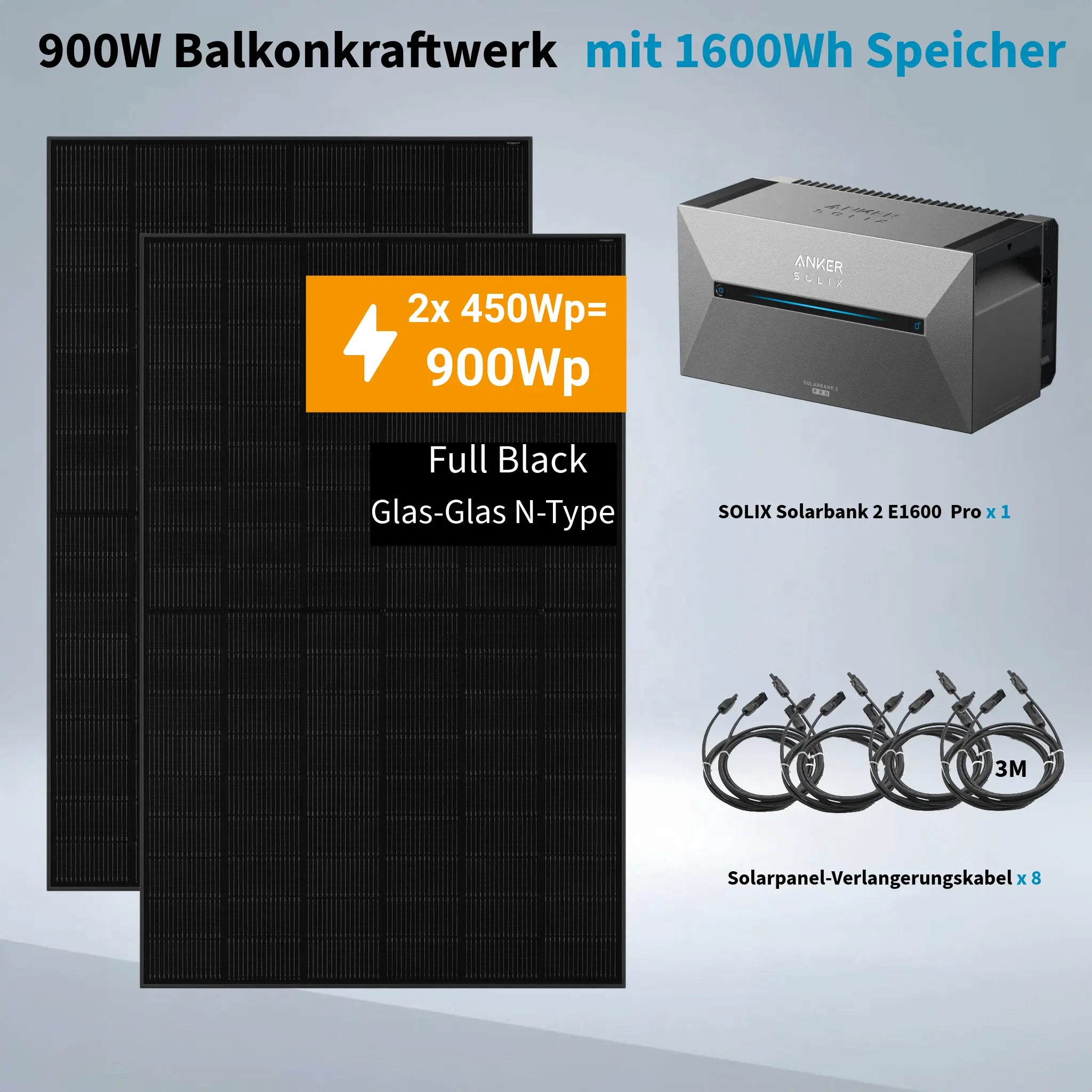 Dieses Komplettset besteht aus dem leistungsstarken ANKER SOLIX Solarbank 2 E1600 Pro Energiespeicher und zwei hocheffizienten 450W JA SOLAR Monokristallin-Solarmodulen – für eine Gesamtleistung von 900W. So schaffen Sie sich mühelos ein produktives und benutzerfreundliches Balkonkraftwerk.