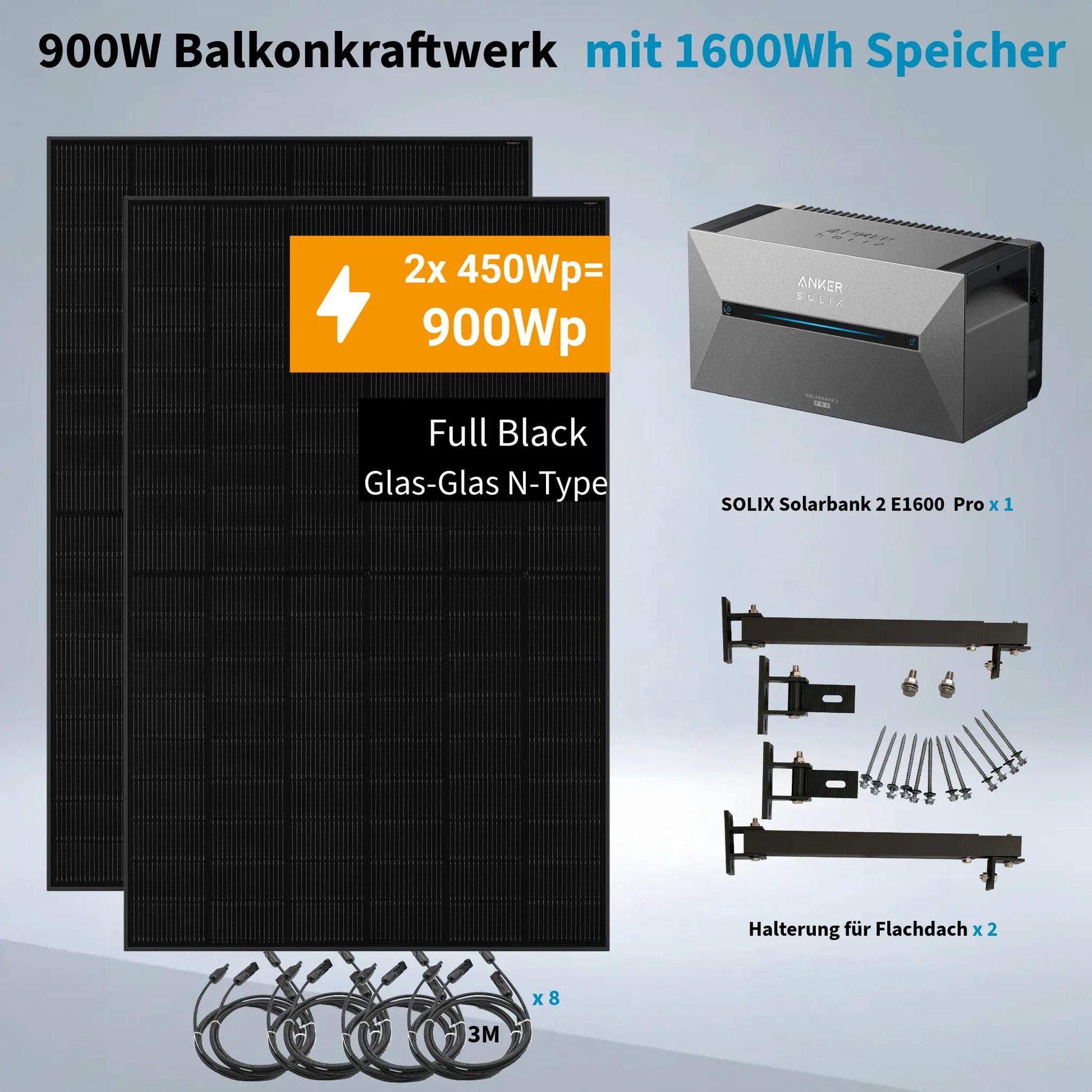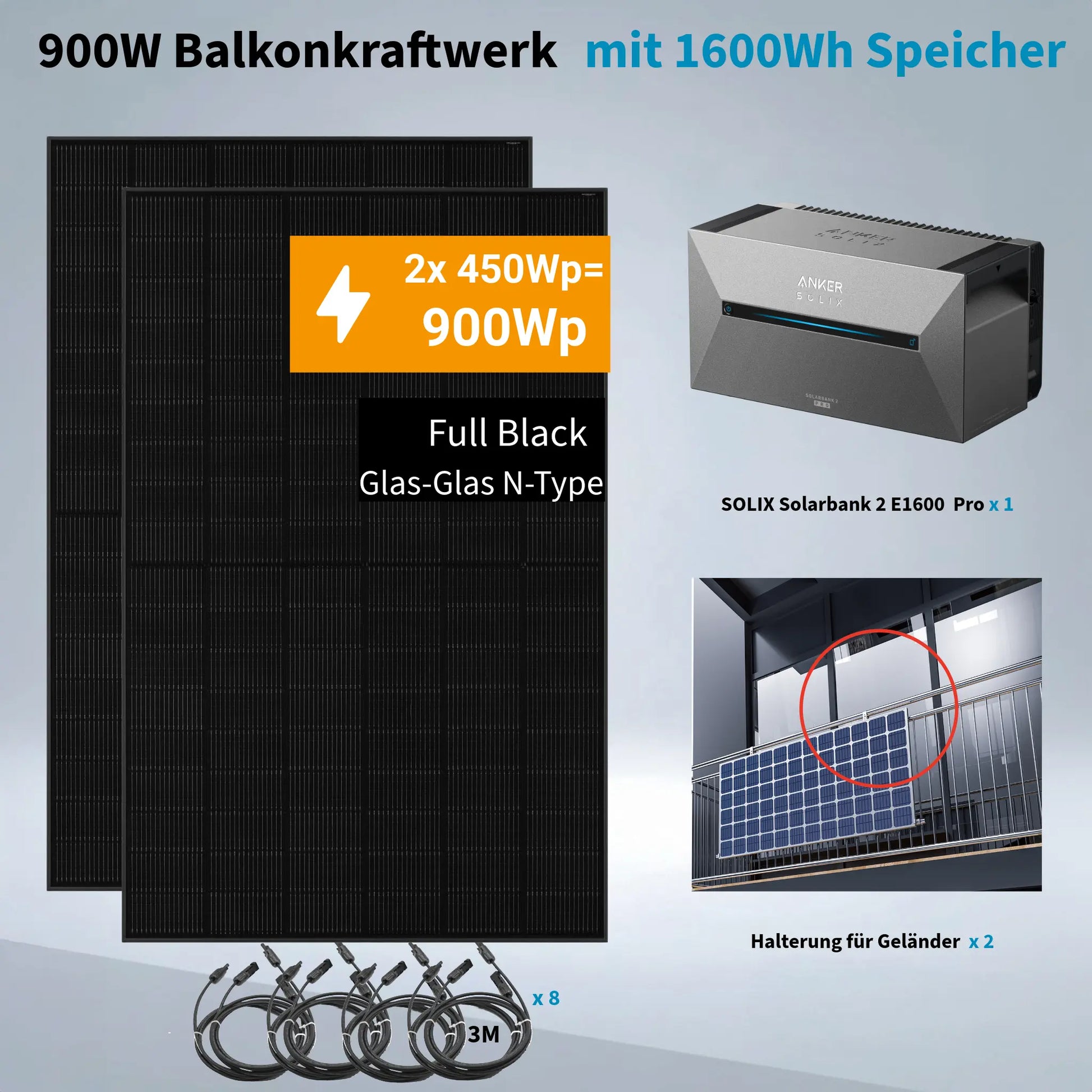 Perfekte Balkonkraftwerk-Lösung: ANKER SOLIX Solarbank 2 Pro + 2x JA SOLAR 450W Module + Ohne Halterung / Halterung für Balkongeländer / Halterung für Flachdach