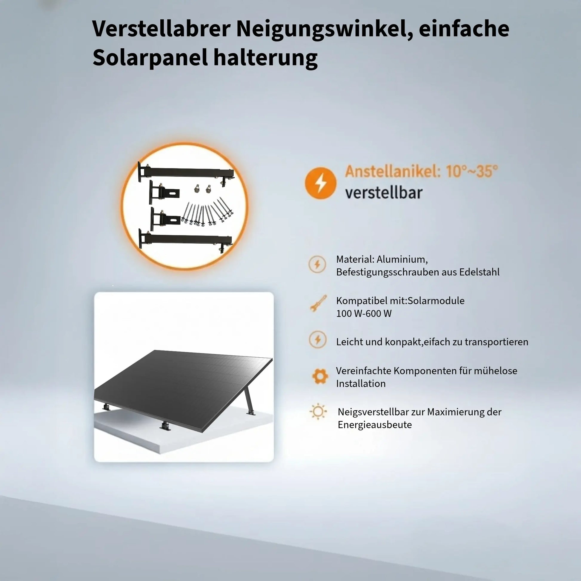 Montageset für Geländer: Einstellbare Winkel: 0° und 15-30° für optimale Energieerzeugung. Einfache Installation: Modularer Aufbau mit Plug-and-Play-Anschluss, komplett vormontiert für schnelle Montage. Geeignet für Balkone, Geländer und Wände, unterstützt verschiedene Module. Balkon Einfache Solarhalterung, aus korrosionsbeständigen Materialien (AL6005-T5, AL5052, SUS304).