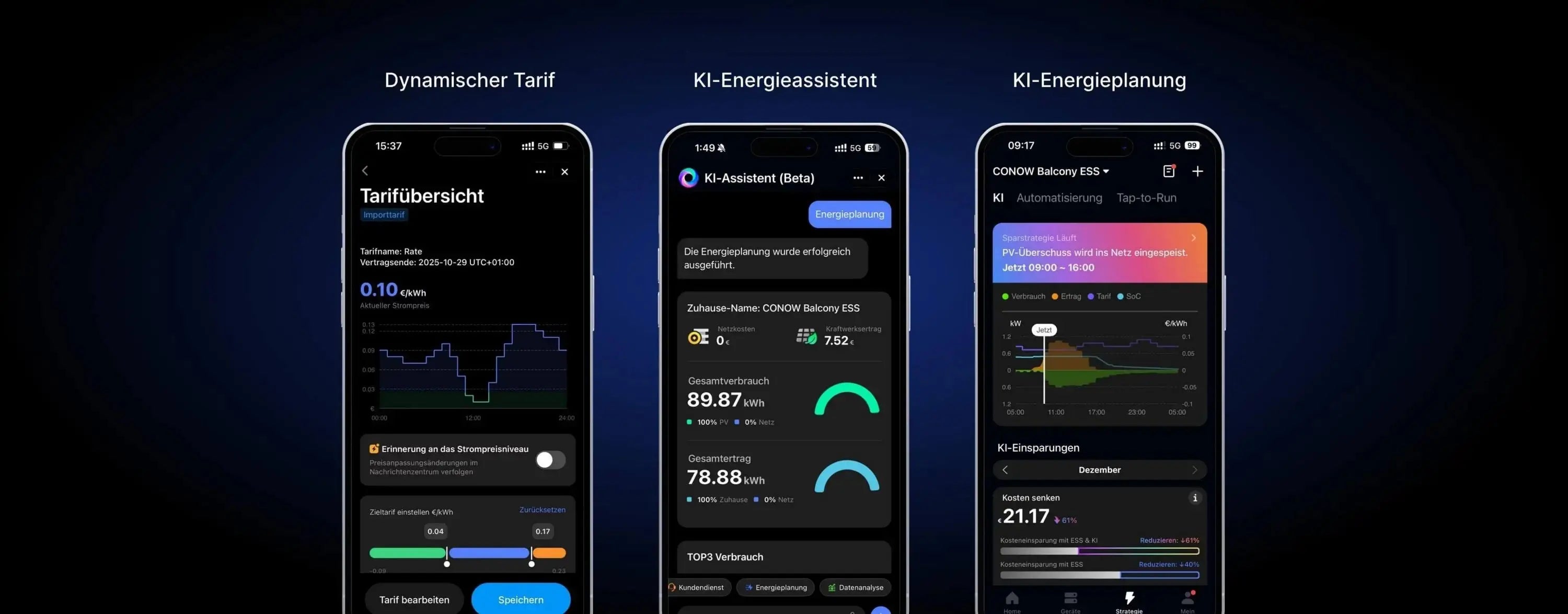 Die integrierte CONOW AI HEMS optimiert automatisch Lade- und Entladezyklen Ihrer Batterie – auch bei schwankenden Strompreisen – für maximale Einsparungen ohne Aufwand. Ein klarer Aktionsplan lässt sich mit nur einem Fingertipp aktivieren.