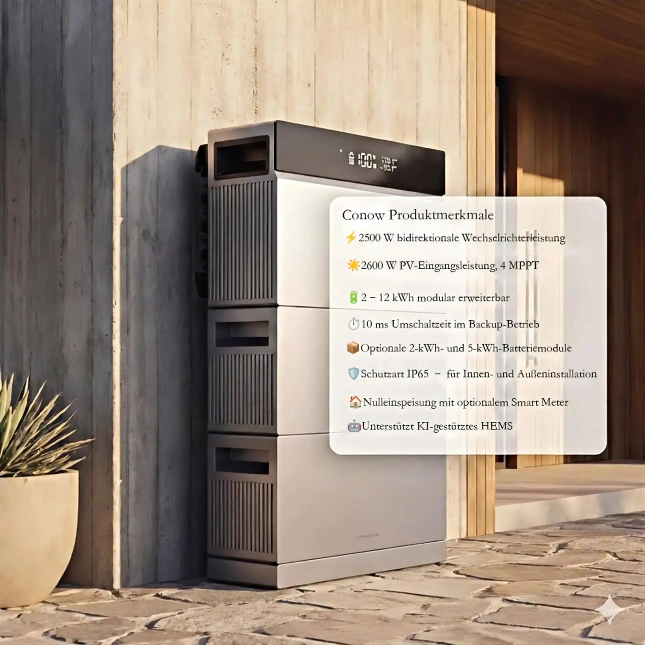 Die Conow CBE2000 Pro bietet eine intelligente, zuverlässige und flexible Lösung für alle, die ihre Energieautonomie maximieren möchten – egal ob Zuhause, im Garten oder unterwegs im Camper. Mit modularer Erweiterbarkeit, KI-gestütztem Energiemanagement und robustem Design ist sie die perfekte Wahl für ein modernes, zukunftssicheres Energiesystem.