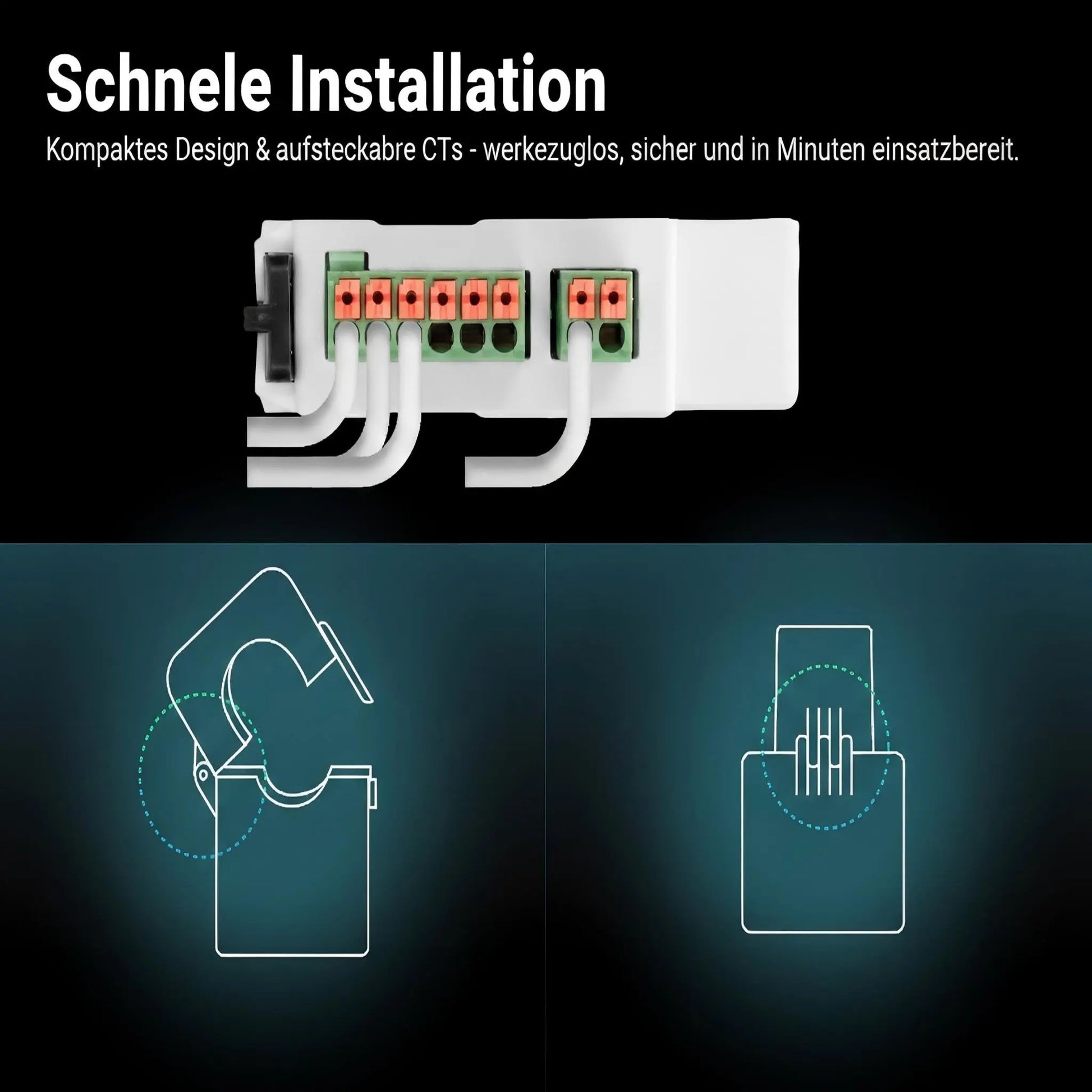 Einfache Installation: Kompaktes Design mit aufsteckbarem CT und Steckklemmen ermöglicht werkzeuglose Installation, erhöht die Sicherheit und spart Zeit.