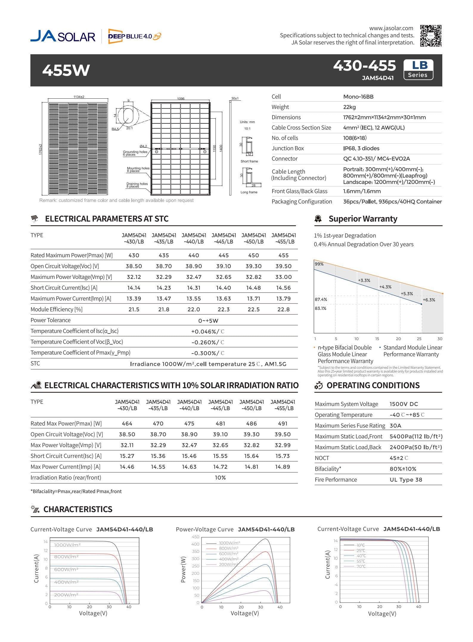 Dieses bifaziale Glas-Glas Modul von JA Solar erreicht einen beeindruckenden Wirkungsgrad von 22.0 % bei einer Leistung von 440W – ideal für maximale Energieausbeute auf begrenzter Fläche.