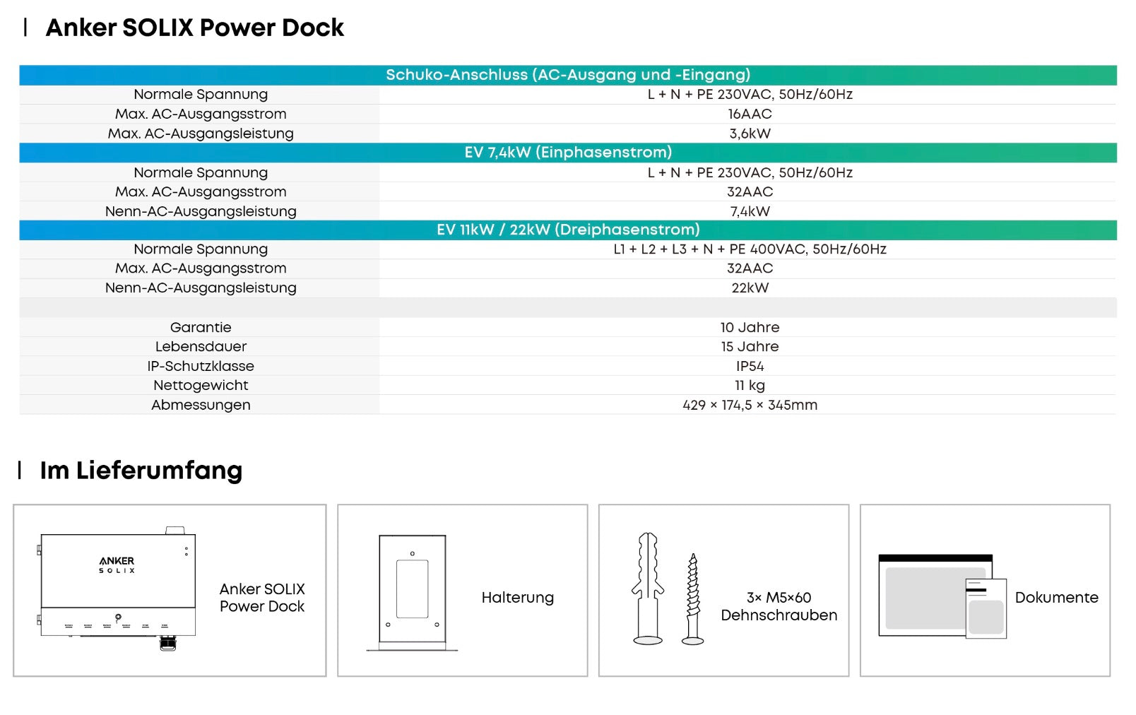 AC-Eingang/-Ausgang Power Dock: 230 VAC, 16 A, bis 3,6 kW