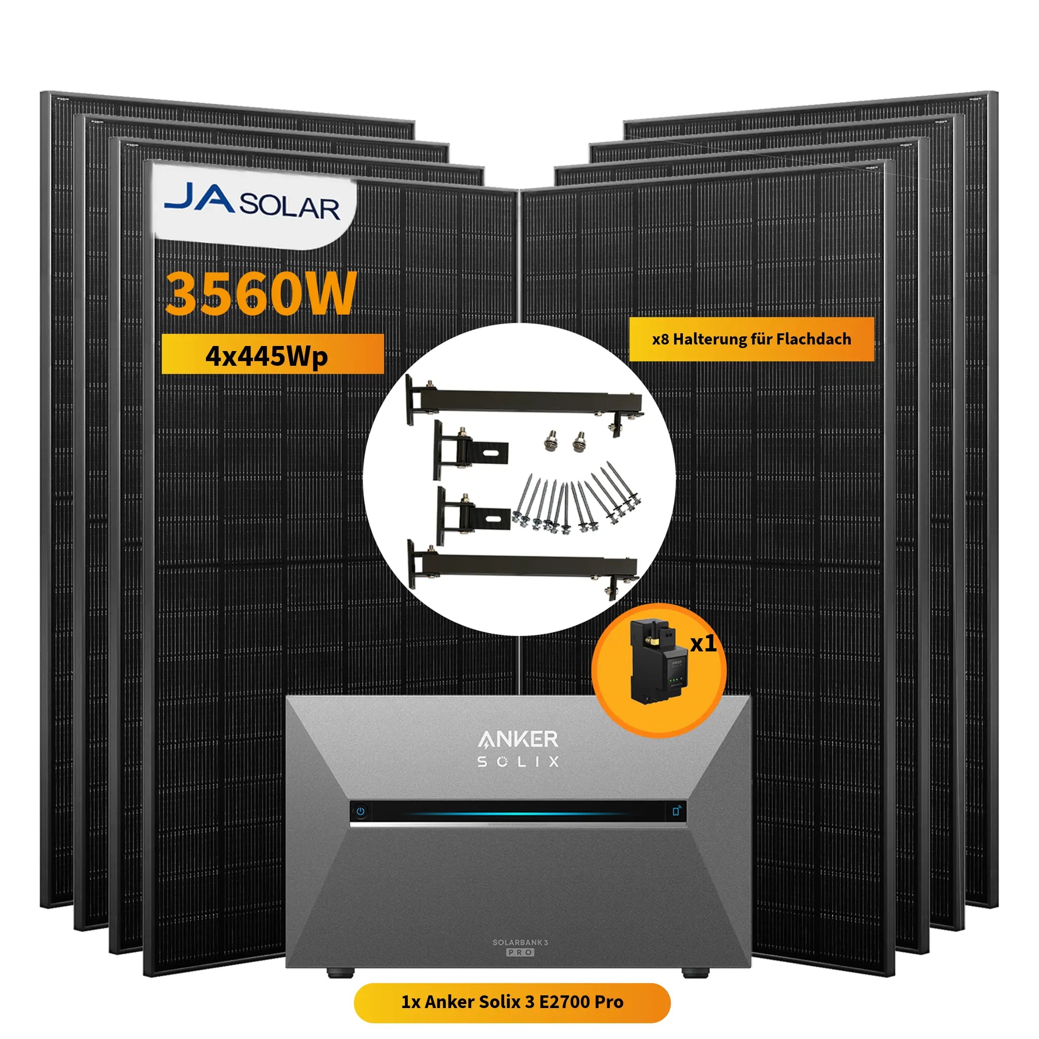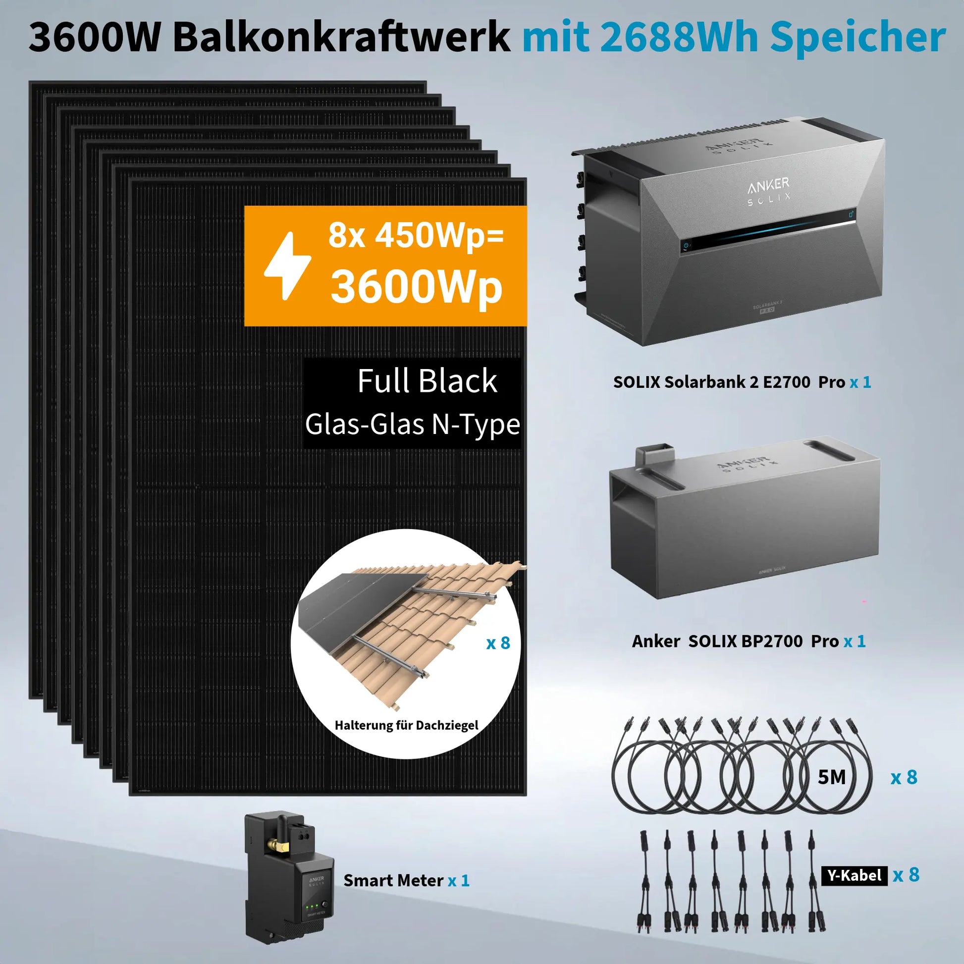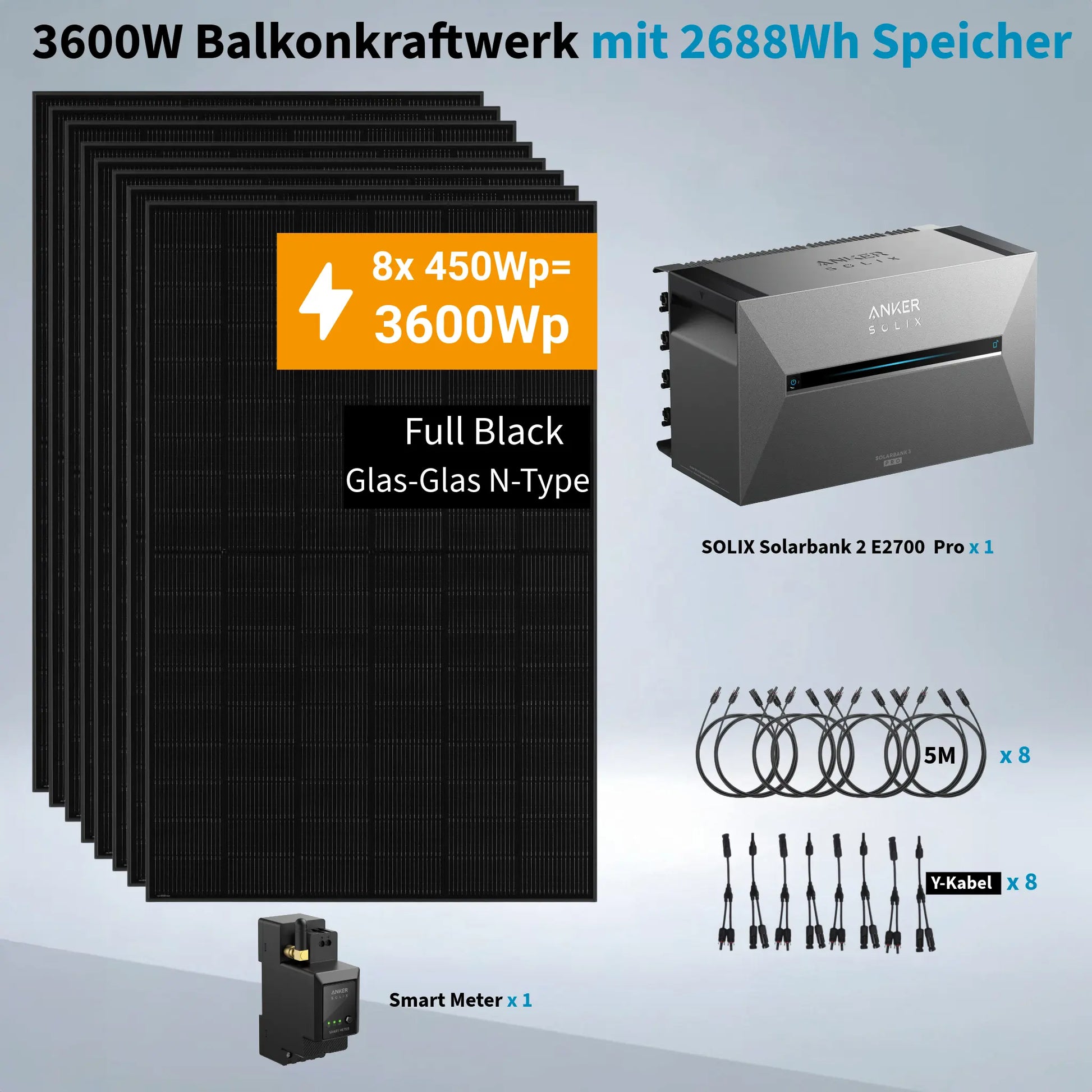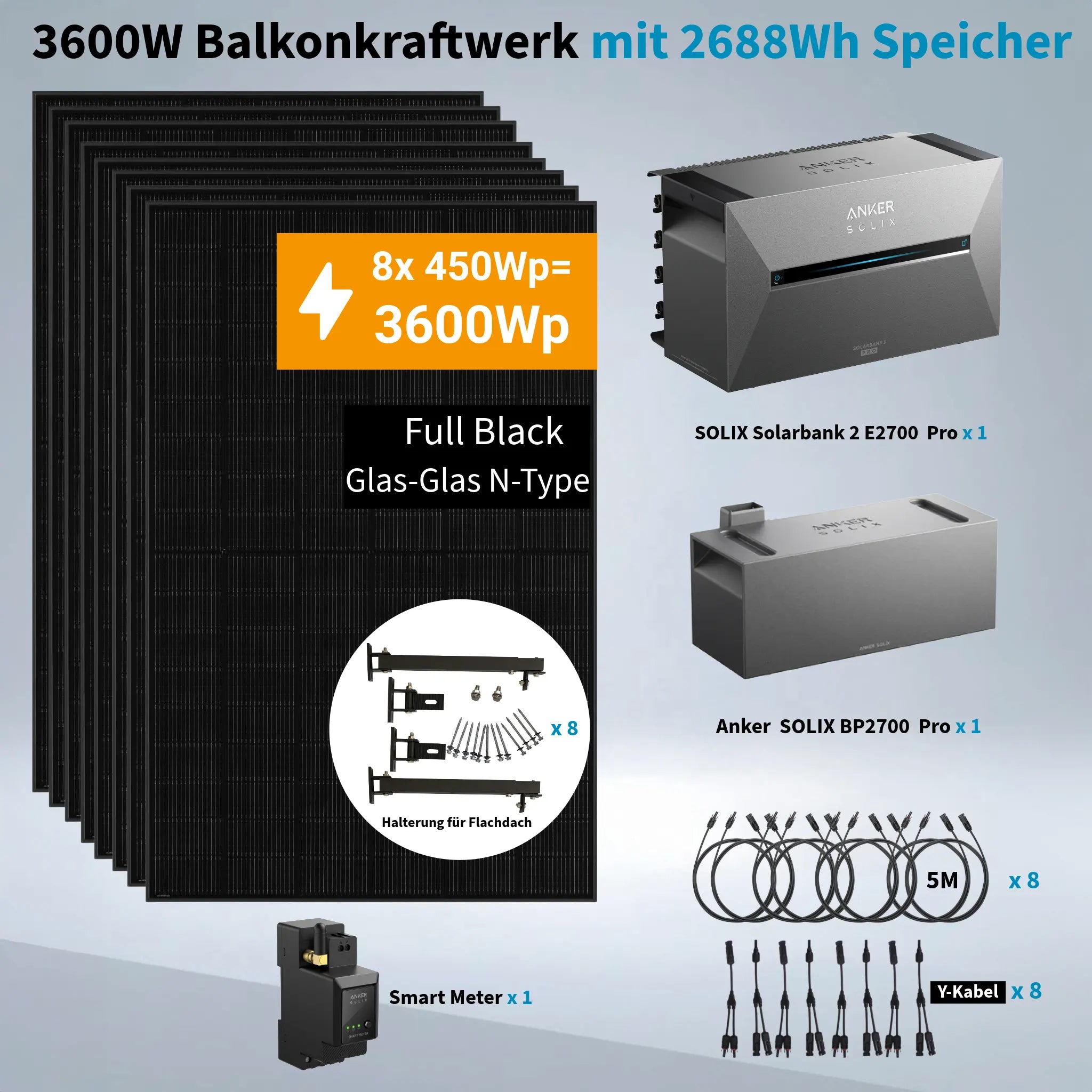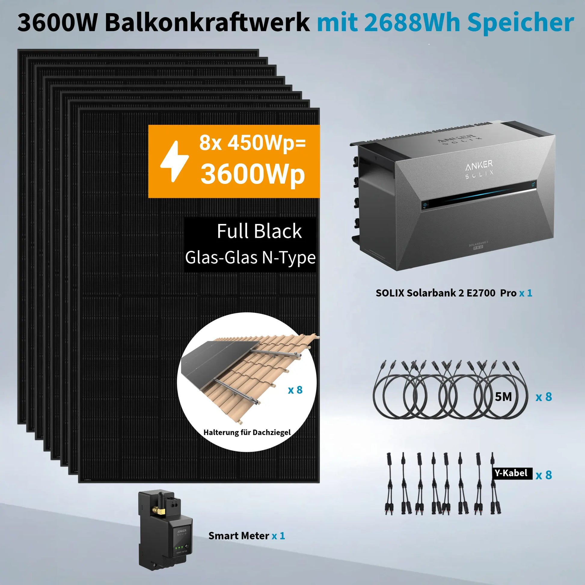 Dieses Set besteht aus dem ANKER SOLIX Solarbank 3 Pro Energiespeicher und 8 hocheffizienten 450W JA SOLAR Monokristallin-Solarmodulen – für eine Gesamtleistung von beeindruckenden 3600W. So bauen Sie sich im Handumdrehen ein leistungsstarkes und benutzerfreundliches Balkonkraftwerk auf.