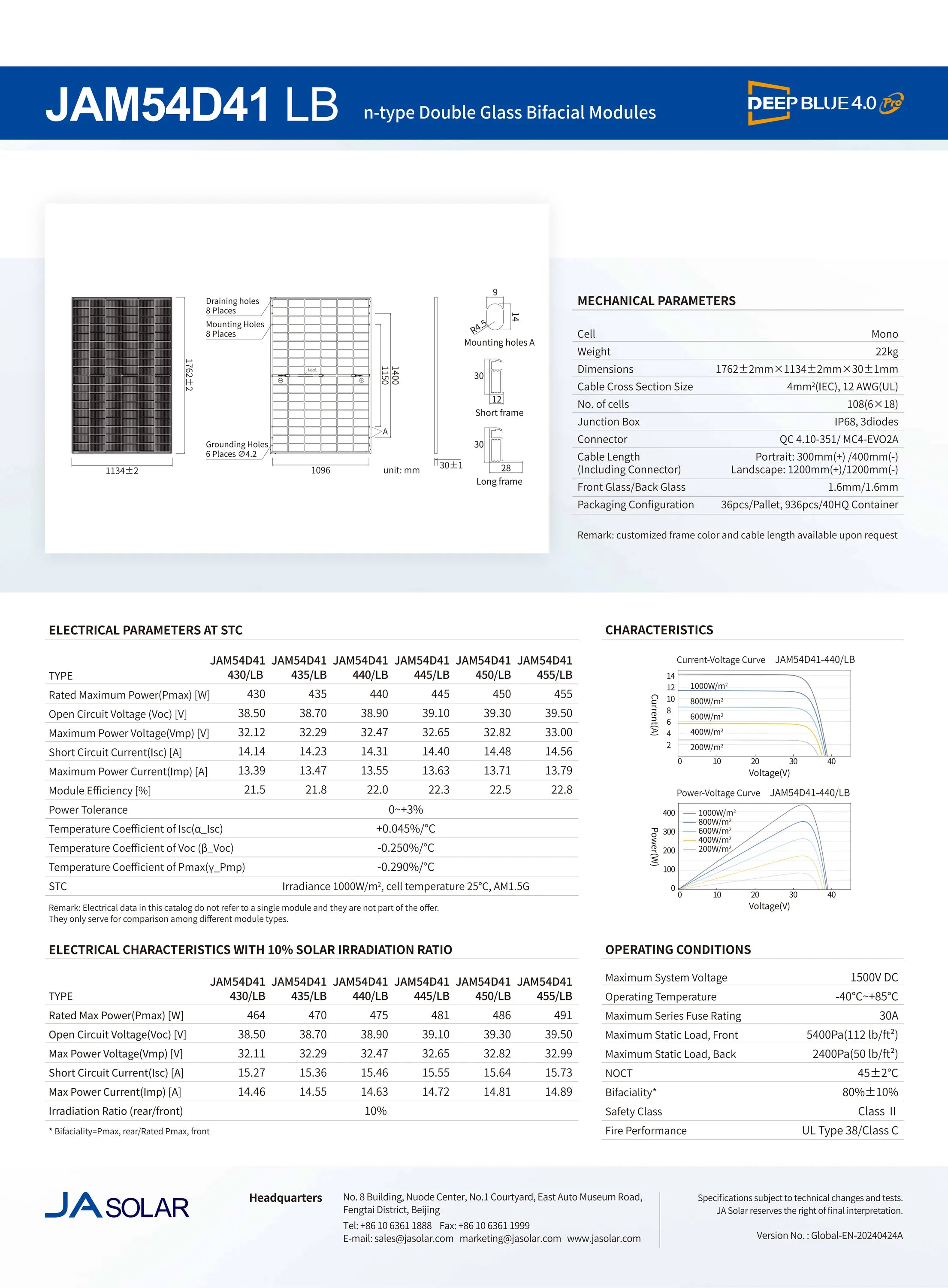 Mit der fortschrittlichen N-Typ-Technologie erzeugt dieses Modul 3,9 % mehr Strom als herkömmliche P-Typ-Module. Dank der DeepBlue 4.0-Generation bietet es höhere Effizienz, bessere Leistung, längere Lebensdauer und einen niedrigeren Temperaturkoeffizienten. Das bifaziale Glas-Glas-Design ermöglicht eine 80%ige Rückseitenausbeute (±10%) und erreicht einen Wirkungsgrad von 22,5 % bei einer Nennleistung von 450W – ideal für maximale Energieerzeugung auf begrenztem Raum.