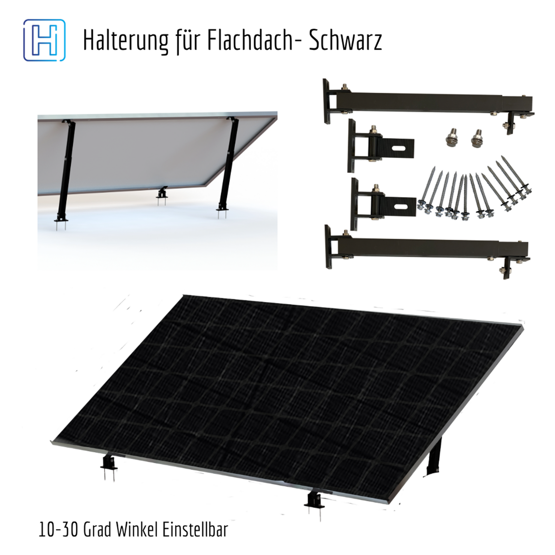 Montageset für Flachdach: Speziell entwickelt für Flachdächer, Garagen, Autoschuppen, Wände, Böden, Wohnmobile und Boote. Dank der einfachen Konstruktion ist die Installation besonders schnell. Befestigungsschrauben aus Edelstahl sind im Lieferumfang enthalten. Die Aluminiumstrukturen ermöglichen Dach-, Wand- und Bodenmontage mit einem einstellbaren Winkel von 10–35°. Eigenschaften: große Tragfähigkeit, starke Korrosionsbeständigkeit, geeignet für 100W bis 600W Panels.