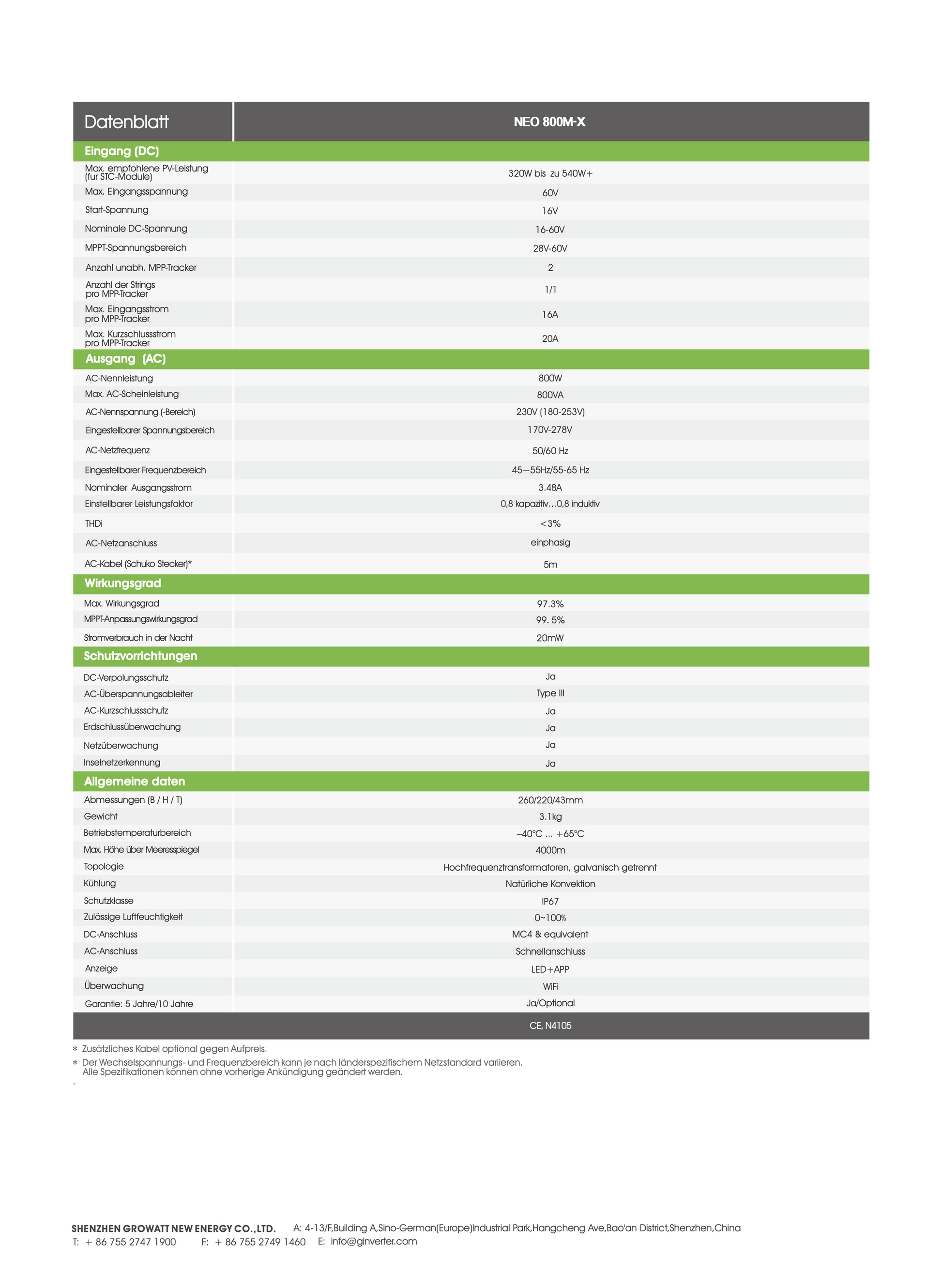 Mit 2 unabhängigen MPPT-Eingängen und einer beeindruckenden maximalen PV-Leistung von 320W bis zu 540W ist dieser Wechselrichter hervorragend für kleinere Anlagen geeignet. Zudem bietet der Wechselrichter eine WiFi-Funktion, die eine mühelose Systemüberwachung ermöglicht. Dies macht ihn zu einer optimalen Wahl für die Einrichtung und Verwaltung von Balkonkraftwerken, wo Benutzerfreundlichkeit und hohe Effizienz von großer Bedeutung sind.