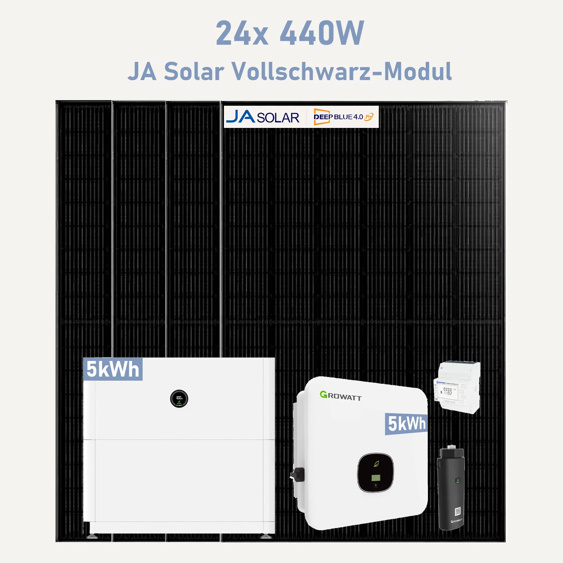 Growatt Balkonkraftwerk-Set mit MOD 5000TL3-XH Wechselrichter, APX 5.0P Batterie, Vollschwarze JA Solar Module, 5kW Hybrid, AC/DC Kompatibel, IP66, LiFePO4, Monitoring inkl. 10 Jahre Garantie
