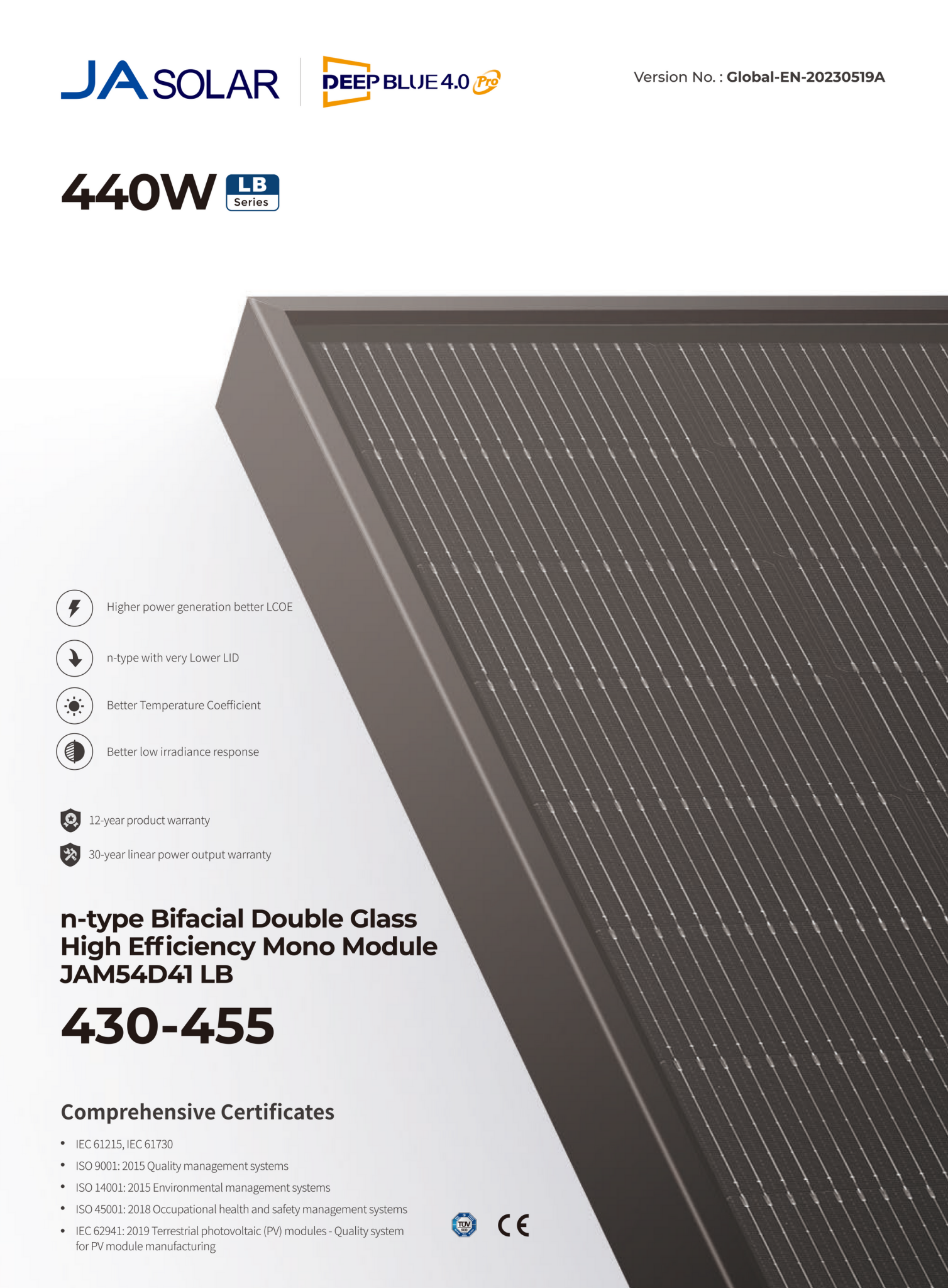 Das JA Solar JAM54D41 ist ein bifaziales Glas-Glas Modul mit 440 W Leistung und 21,8% Wirkungsgrad. Dank der neuesten Generation DeepBlue 4.0 und N-Type Technologie bietet es hohe Effizienz, Langlebigkeit, verbesserte Leistungsfähigkeit und einen niedrigen Temperaturkoeffizienten.