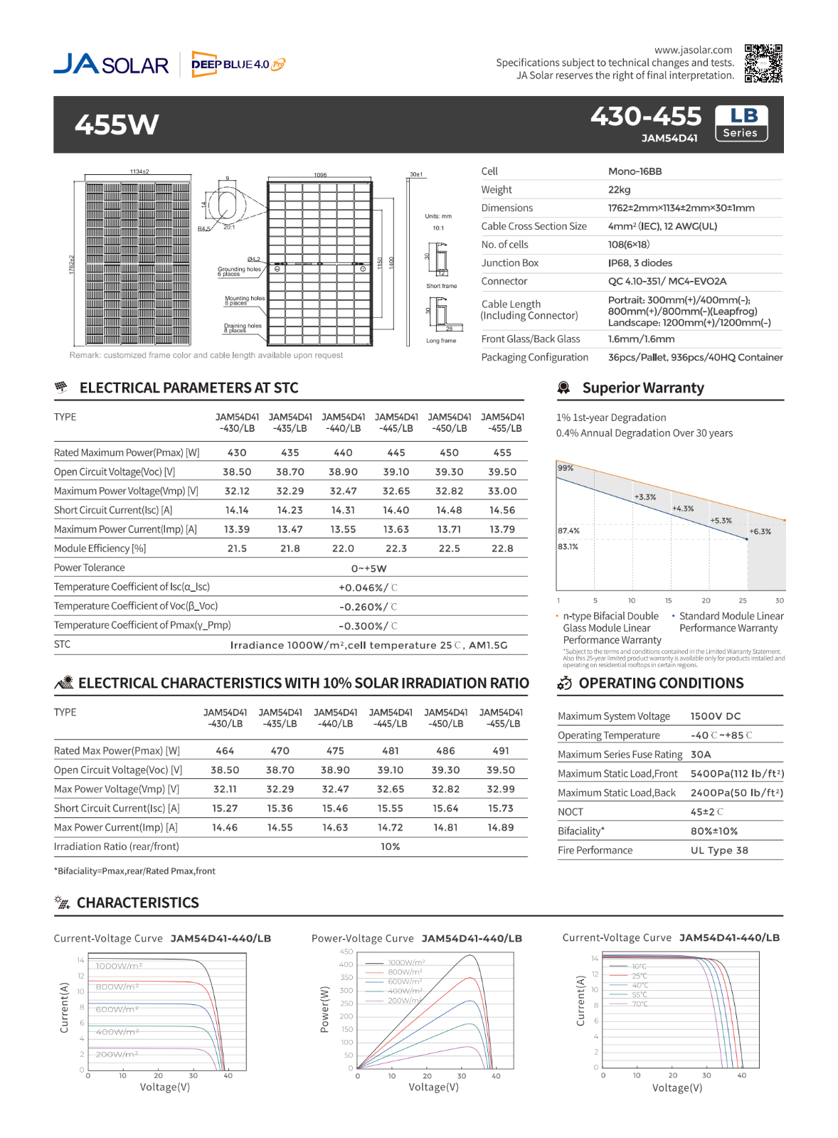 Das JAM54D41 ist mit der neuesten Generation DeepBlue 4.0 und n-Type Technologie ausgestattet, was zu Langlebigkeit, hoher Effizienz, besserer Leistungsfähigkeit und niedrigerem Temperaturkoeffizienten führt.